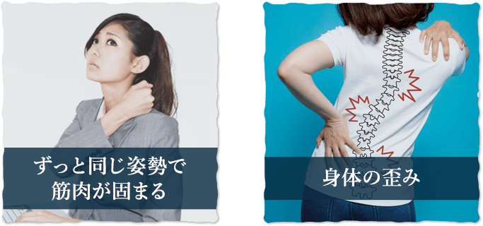 背骨、骨盤がゆがむと、身体はこれ以上歪まないようにするため、筋肉を硬直させます。 これがコリです。